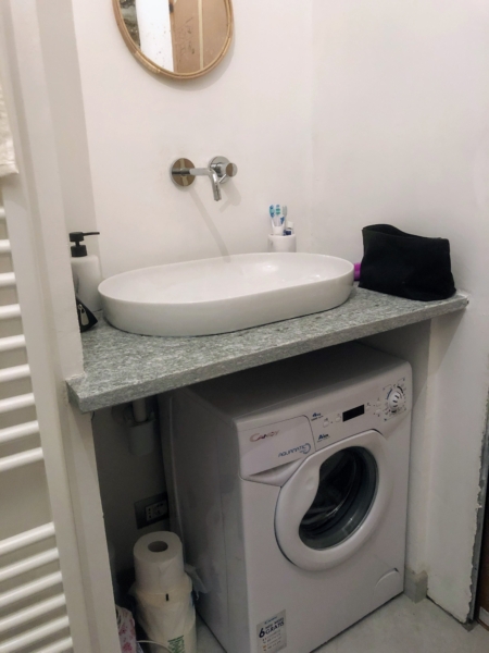 La zona giorno – provvista di aria condizionata – ospita da una parte la zona cottura completa di lavastoviglie e piano ad induzione, dall’altra un ampio divano di fronte alla zona TV